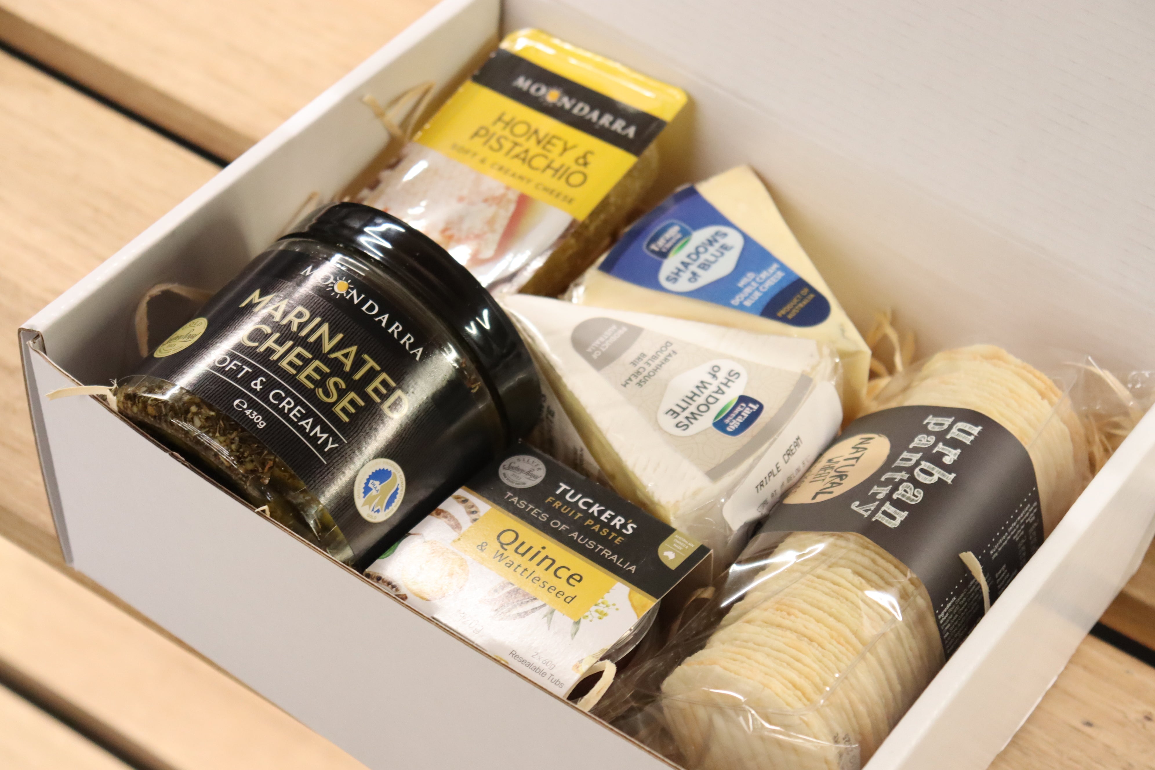 This delightful assortment features a variety of artisanal cheeses, including the rich flavours of Tarago cheese and Moondarra cheese, expertly paired with gourmet accompaniments.
