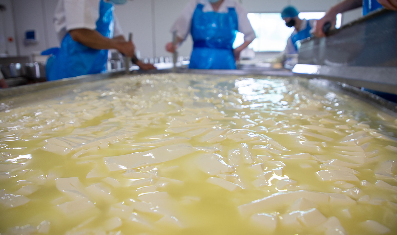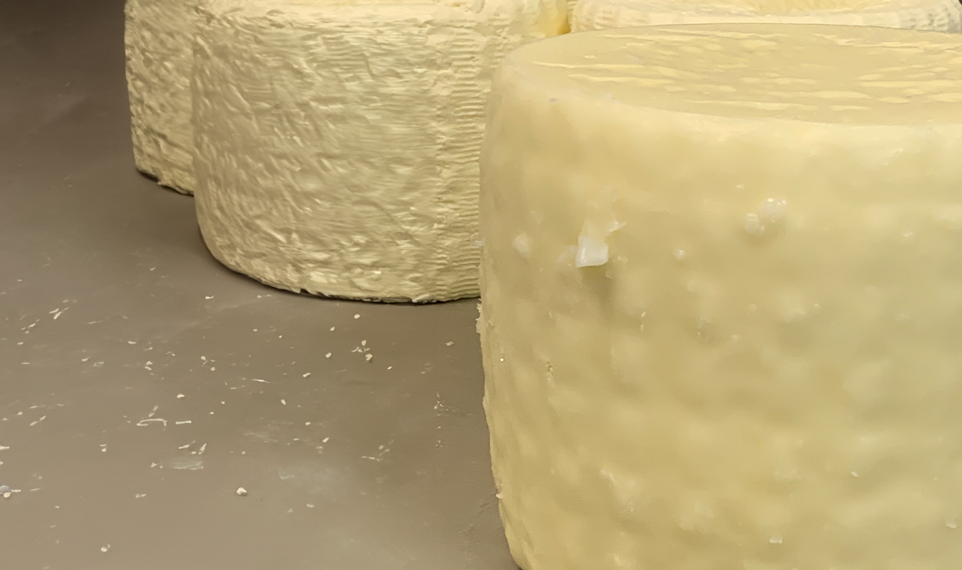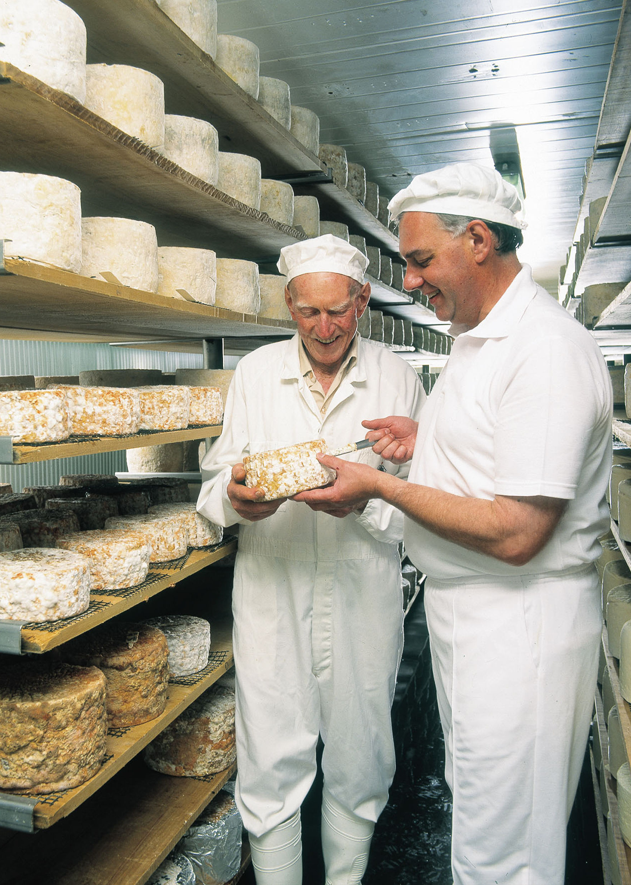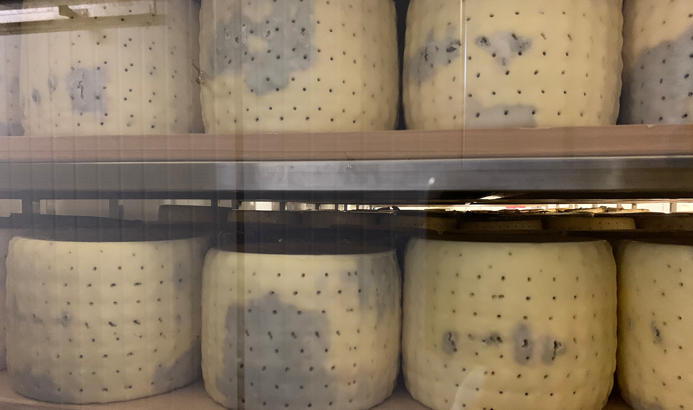 The curds are hooped into large rounds, salted and cellared before being dipped in natural bees wax. This controls moisture and rind growth. Penicillum roqueforti mould is a living thing and requires air to thrive and grow, so we hand spike the cheese to allow air in.
