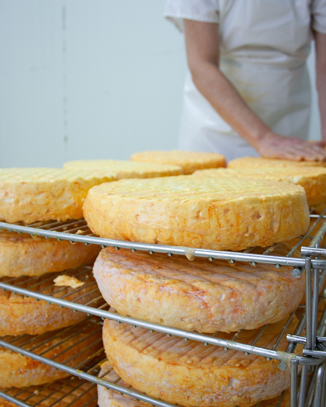 Shadows of Red is a mild washed rind cheese, with a slight pungent aroma, but an oozy inside. It offers a creamy, buttery flavour with hints of earthy mushroom, savoury umami and subtle barnyard notes, all derived from the natural salty brine on the rind and the ripening process within the cheese.